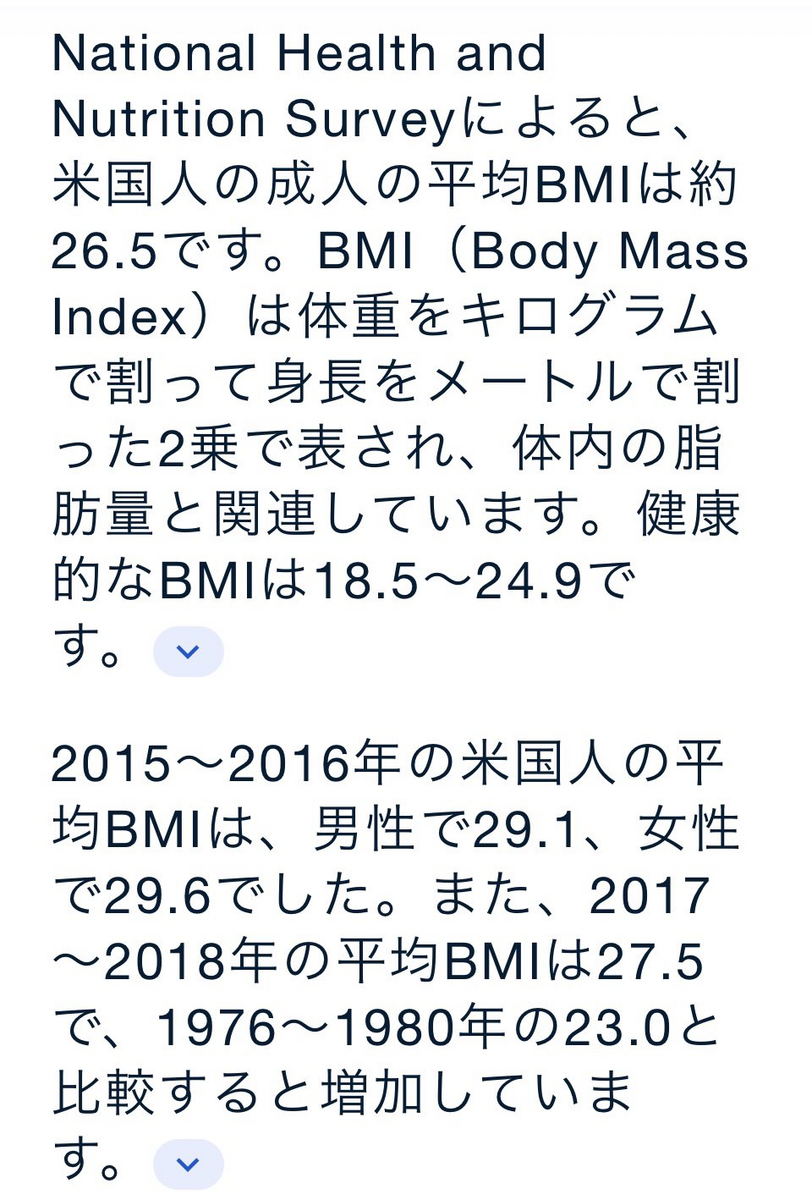 アメリカ人の医療スタッフが「見ろよ今日の患者。完全に栄養失調じゃないか…骨と皮しかない…どうしてこんなことに…」とうつむいていた。確認したらBMI 20。一緒に下を向いた。どうしてこんなことに。